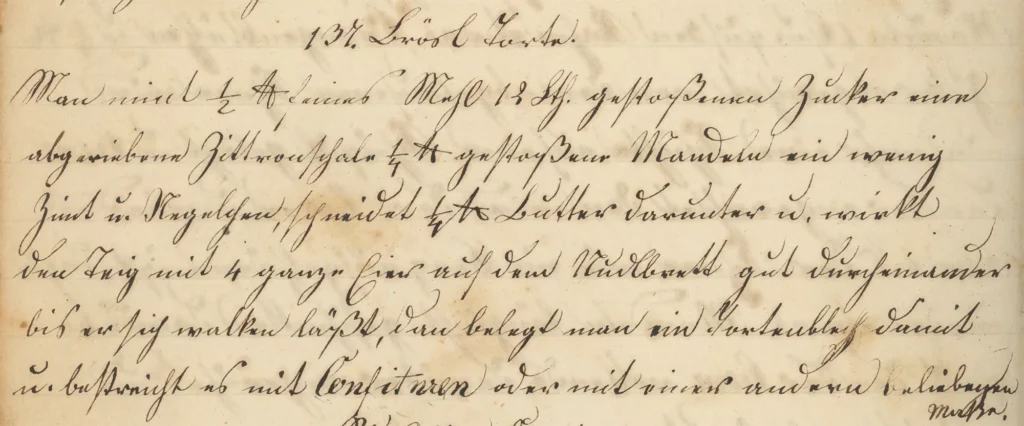 Man nimt 1⁄2 Pf feines Mehl 12 Lth. gestoßenen Zucker eine abgeriebene Zittronschale 1⁄4 Pf gestoßene Mendeln ein wenig Zimt u. Negelchen, schneidet 1⁄4 Pf Butter darunter u. wirktden Teig mit 4 ganz Eir auf dem Nudlbrett gut durcheinanderbis es sich walken läßt, dan belegt man ein Tortenblech damit u. bestreicht es mit Confituren oder mit einer anderen beliebigen Maße.