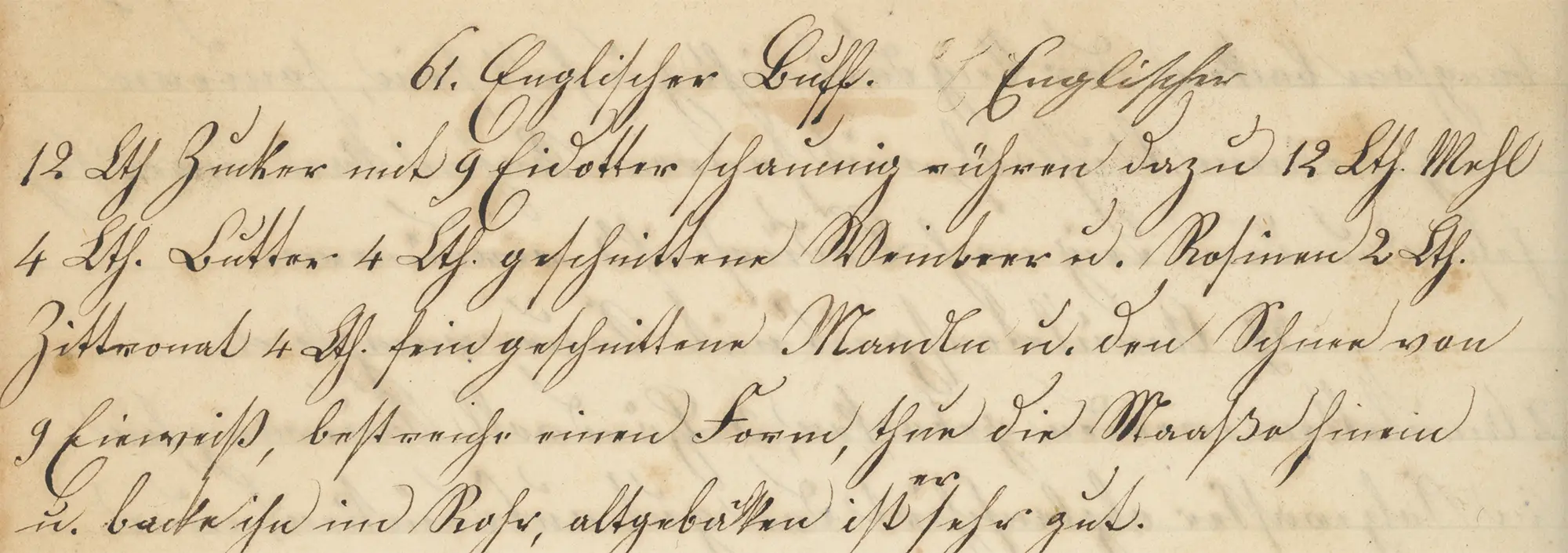 Der schlichte Titel „Englischer“/„Englischer Kuchen“ bezeichnete im deutschsprachigen Raum einen fruchtgefüllten Teekuchen nach britischem Vorbild (Fruit/Tea Cake) mit Rosinen, kandierten Schalenfrüchten und Mandeln. Die Trockenfrüchte heißen im 19. Jahrhundert-Deutsch oft Weinbeeren; Rosinen sind getrocknete Weinbeeren, Sultaninen/Korinthen deren Varianten.