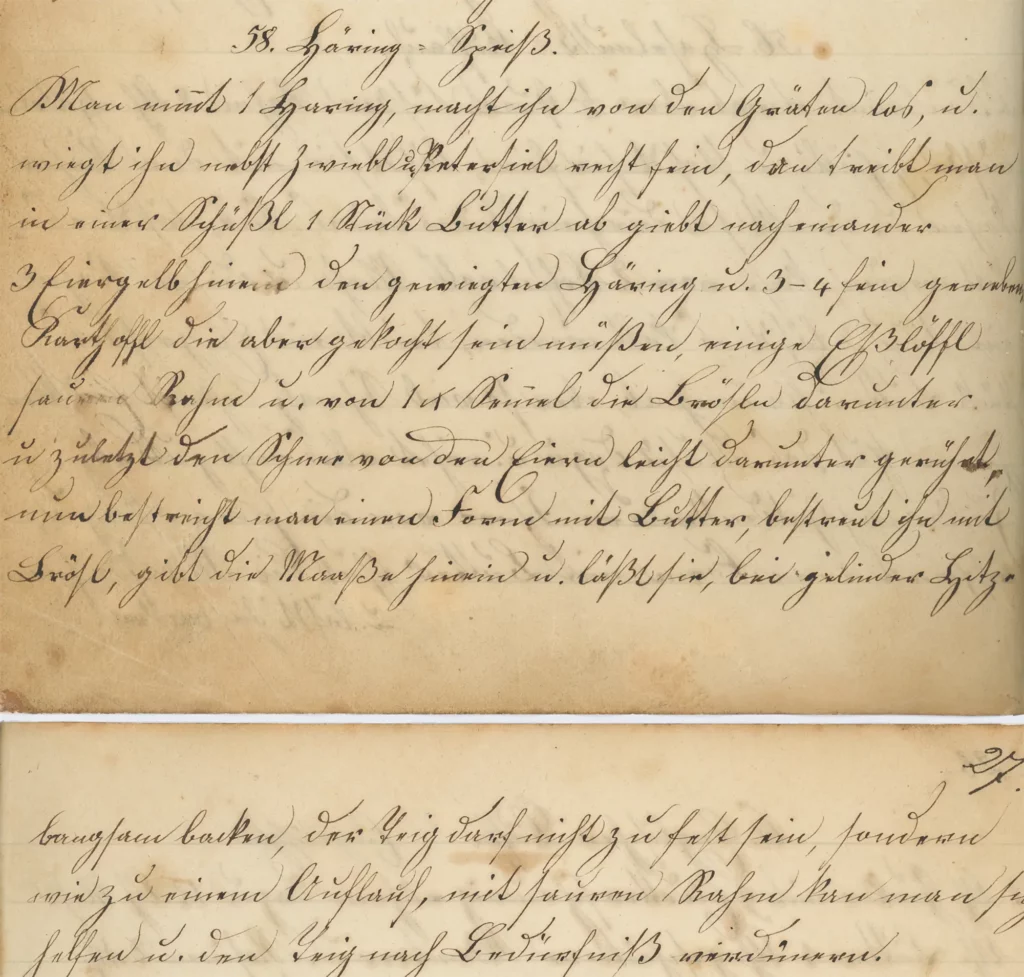 Man nimt 1 Haring, macht ihn von den Gräten los, u.wiegt ihn nebst Zwiebl u. Petersiel recht fein, dan treibt man in einer Schüßl 1 Stück Butter ab giebt nacheinander3 Eiergelb hinein dan gewiegten Häring u. 3-4 fein geriebene Karthoffl die aber gekocht sei müßen einige Eßlöfflsauren Rahm u. von 1 x Semmel die Brösln darunteru zuletzt den Schnee von den Eiern leicht darunter gerührt, nun bestreicht man einen Form mit Butter, bestreut ihn mit Brösl, gibt die Maaße hinein u. läßt sie, bei gelinder Hitzelangsam backen, der Teig darf nicht zu fest sein, sondern wie zu einem Auflauf, mit sauren Rahm kann man sich helfen u. den Teig nach Bedürfniß eindünnen.