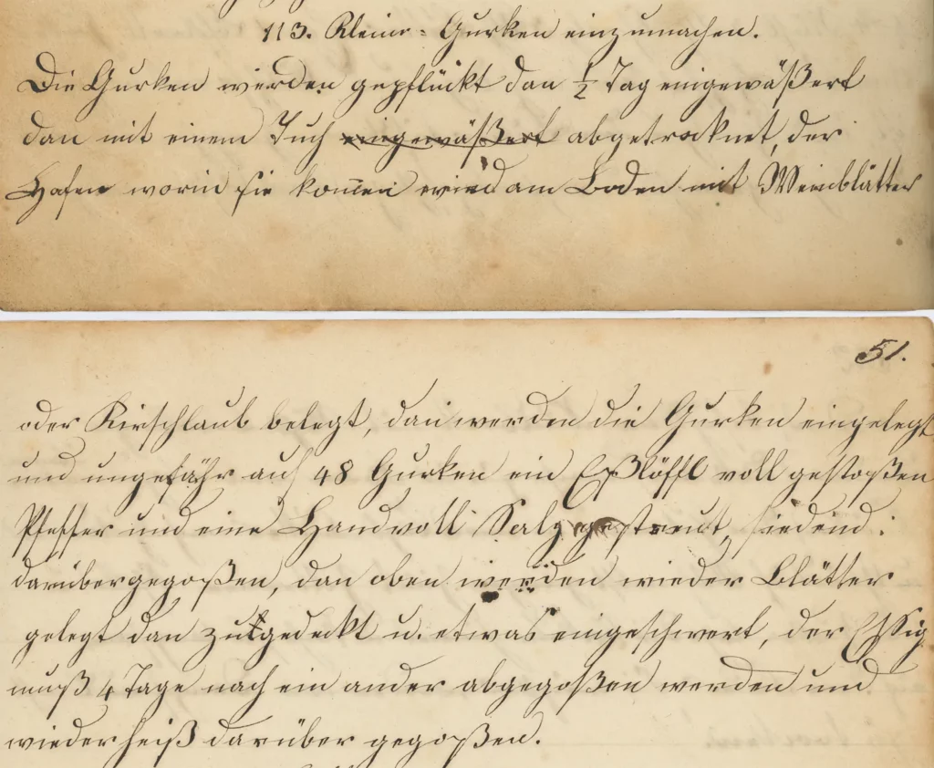 Die Gurken werden gepflückt dan 1⁄2 Tag eingewäßert dan mit einem Tuch eingewäßert abgetrocknet, der Hafen worin sie kommen wird am Boden mit Weinblätteroder Kirschlaub belegt, dan werden die Gurken eingelegt und ungefähr auf 48 Gurken ein Eßlöffl voll gestoßen Pfeffer und eine Handvoll Salz gestreut, siedend darübergegoßen, dan oben werden wieder Blättergelegt dan zugedeckt u. etwas eingeschwert, der Eßig muß 4 Tage nach ein ander abgegoßen werden und wieder heiß darüber gegoßen.