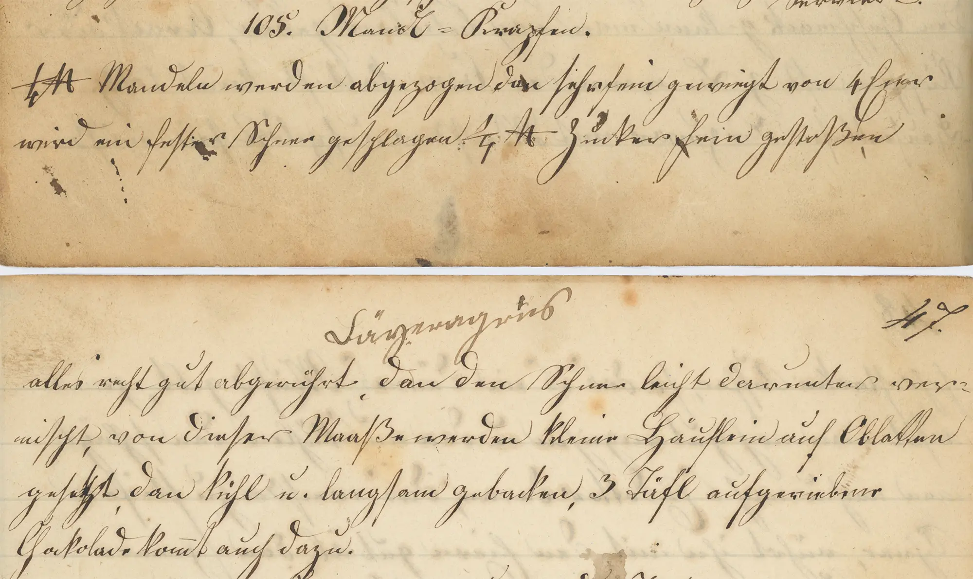 1⁄4 Pf Mandeln werden abgezogen dan sehr fein gewiegt von 4 Eier wird ein fester Schnee geschlagen 1⁄4 Pf Zucker fein gestoßenalles recht gut abgerührt, dan den Schnee leicht darunter ver- mischt, von dieser Maaße werden kleine Häuflein auf Oblatten gesetzt, dann kühl u. langsam gebacken, 3 Täfl aufgeriebene Chockolade kommt noch dazu.