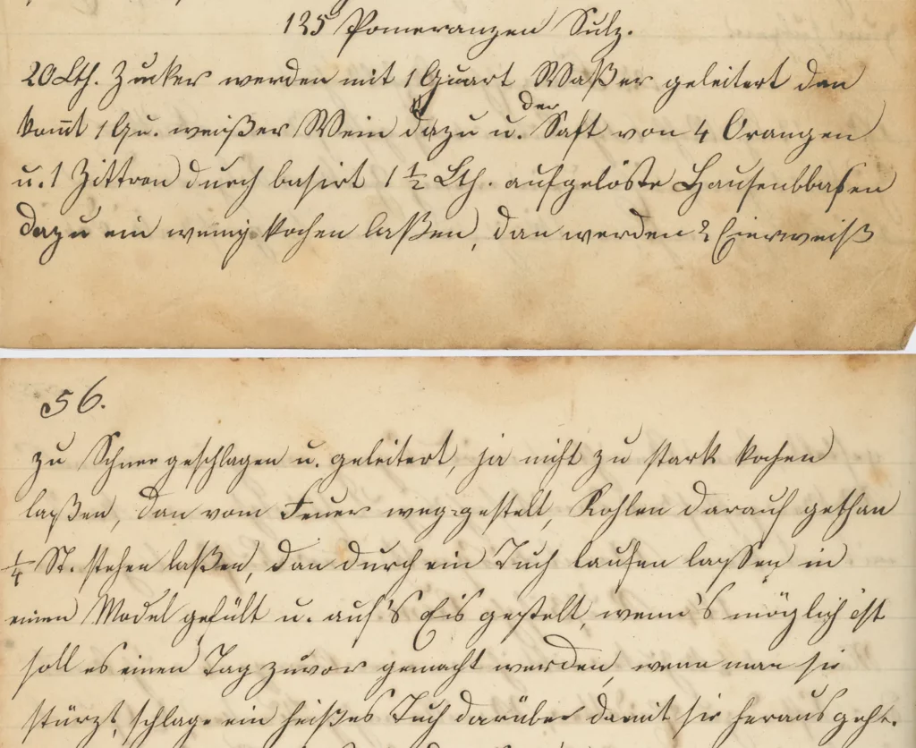 20 Lth. Zucker werden mit 1 Quart Waßer geleitert dan kommt 1 Qu. weißer Wein dazu u. der Saft von 4 Orangen u. 1 Zittron durch basirt 1 1⁄2 Lth. aufgelöster Hausenblasen dan ein wenig kochen laßen, dan werden 2 Eierweißzu Schnee geschlagen u. geleitert, hir nicht zu stark kochen laßen, dan vom Feuer weggestelt, Kohlen darauf gethan1⁄4 St. stehen laßen, dan durch ein Tuch laufen laßen ineinen Model gefült u. auf’s Eis gestelt, wenn’s möglich istsoll es einen Tag zuvor gemacht werden, wenn man siestürzt, schlage ein heißes Tuch darüber damit sue heraus geht.