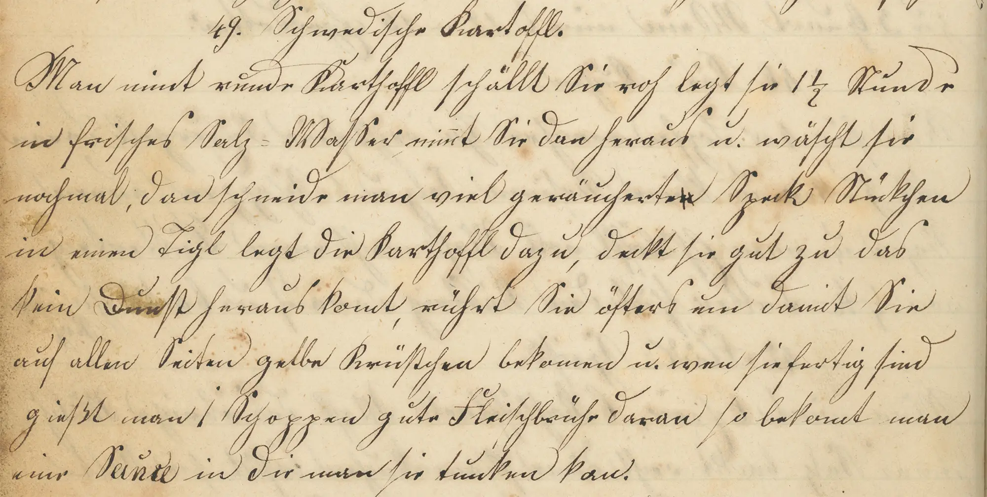 Man nimt runde Karthoffl schällt Sie roh legt sie 1 1⁄2 Stundein frisches Salz-Wasser nimmt Sie dan heraus u. wäscht sie nochmal, dan schneide man viel geräuchten Spreck-Stückchen in einen Tigl legt die Karthoffl dazu, deckt sie gut zu daskein Dunst heraus komt, rührt Sie öfters um damit Sieauf allen Seiten gelbe Krüstchen bekomen u. wen sie fertig sind gießt man 1 Schoppen gute Fleischbrühe daran so bekomt man eine Sauce in die man sie tunken kann.