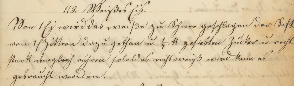 Von 1 Ei wird das weiße zu Schnee geschlagen der Saft von 1 Zittron dazu gethan u. 1⁄4 Pf gesiebten Zucker u. recht stark aber gleich rühren sobald es recht weiß wird kann es gebraucht werden.